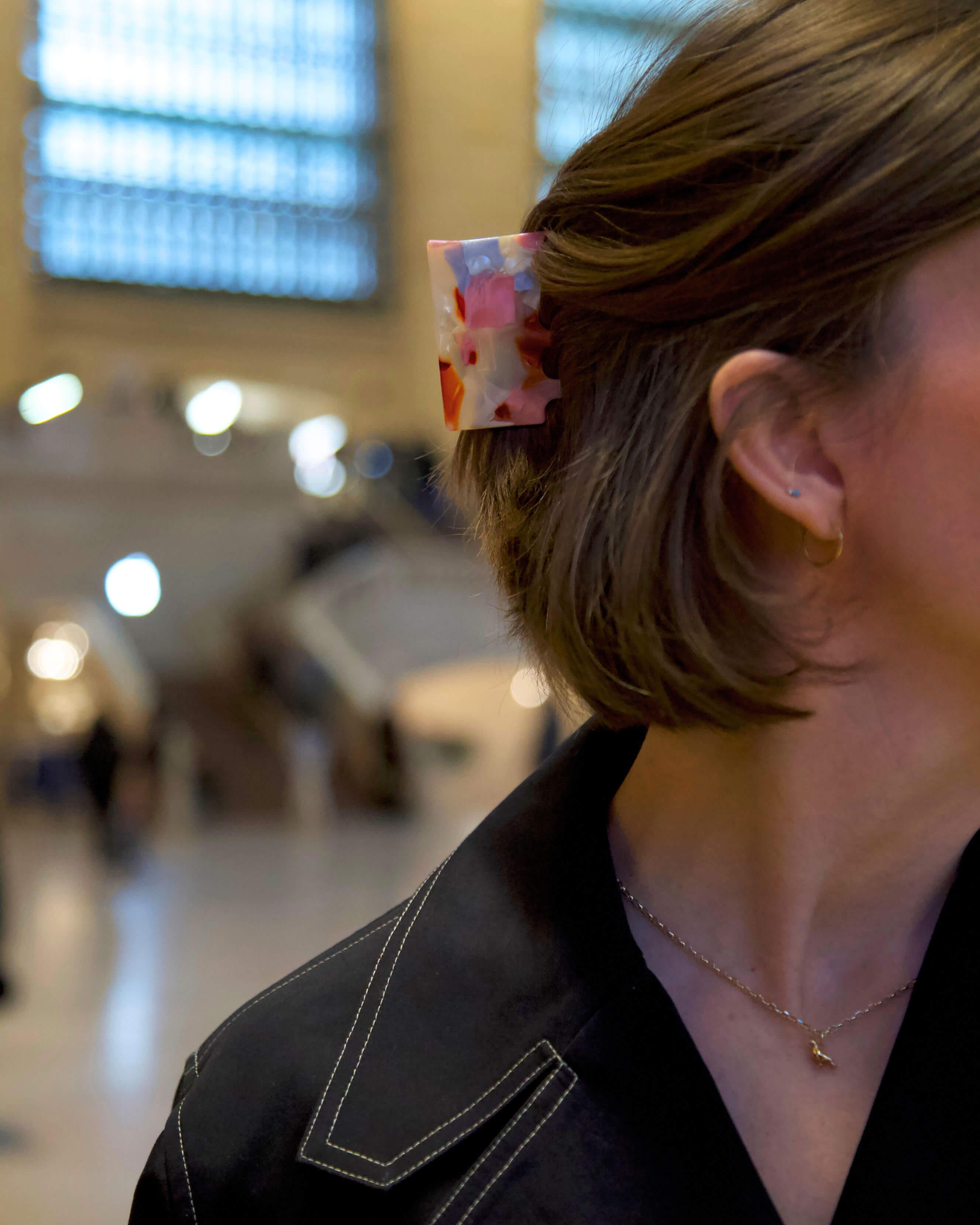 A hand-crafted hair claw clip designed to stylishly, securely and comfortably hold all hair types and most hair textures.