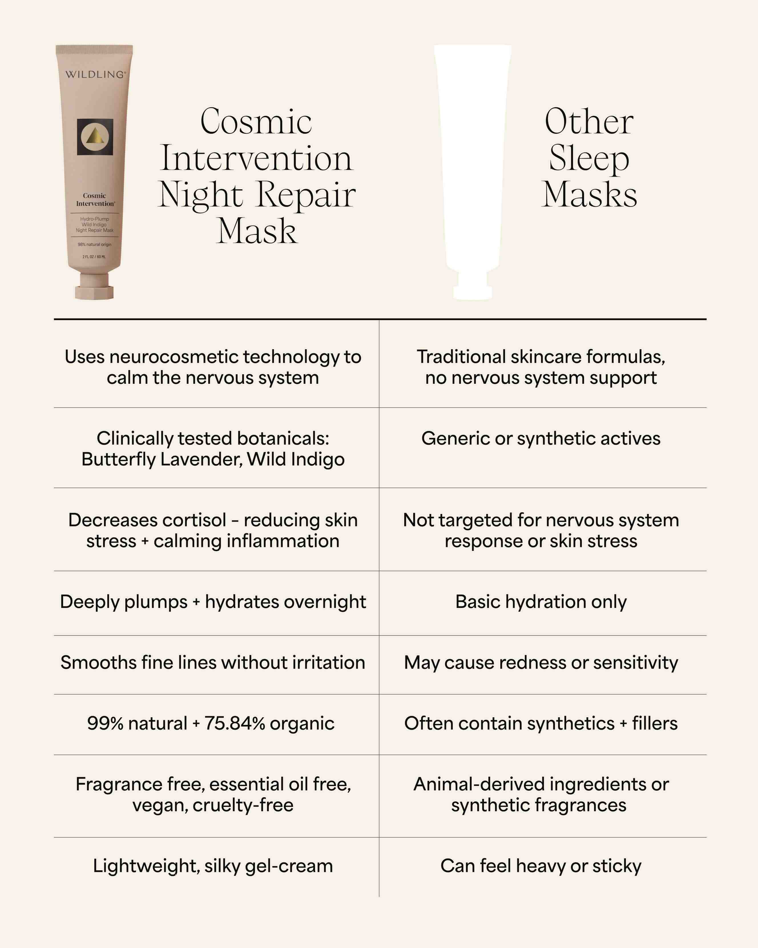 Wildling’s Cosmic Intervention Night Repair Mask is a luxurious gel‑cream powered by clinically tested neurocosmetic botanicals—designed not just to repair skin, but to restore calm. Upon application, its silky texture glides effortlessly, dissolving tension and inflammation while locking in moisture. Over time, hero actives like Wild Indigo soothe cortisol-driven redness, Butterfly Lavender helps smooth expression wrinkles through nerve relaxation and beta endorphin release, and Peat Moss delivers rich humic acids and minerals for pliable, dewy skin. The scent is softly herbaceous and warm—derived from whole plant extracts like Blue Chamomile and Butterfly Lavender—for a gentle meditative experience before bed.