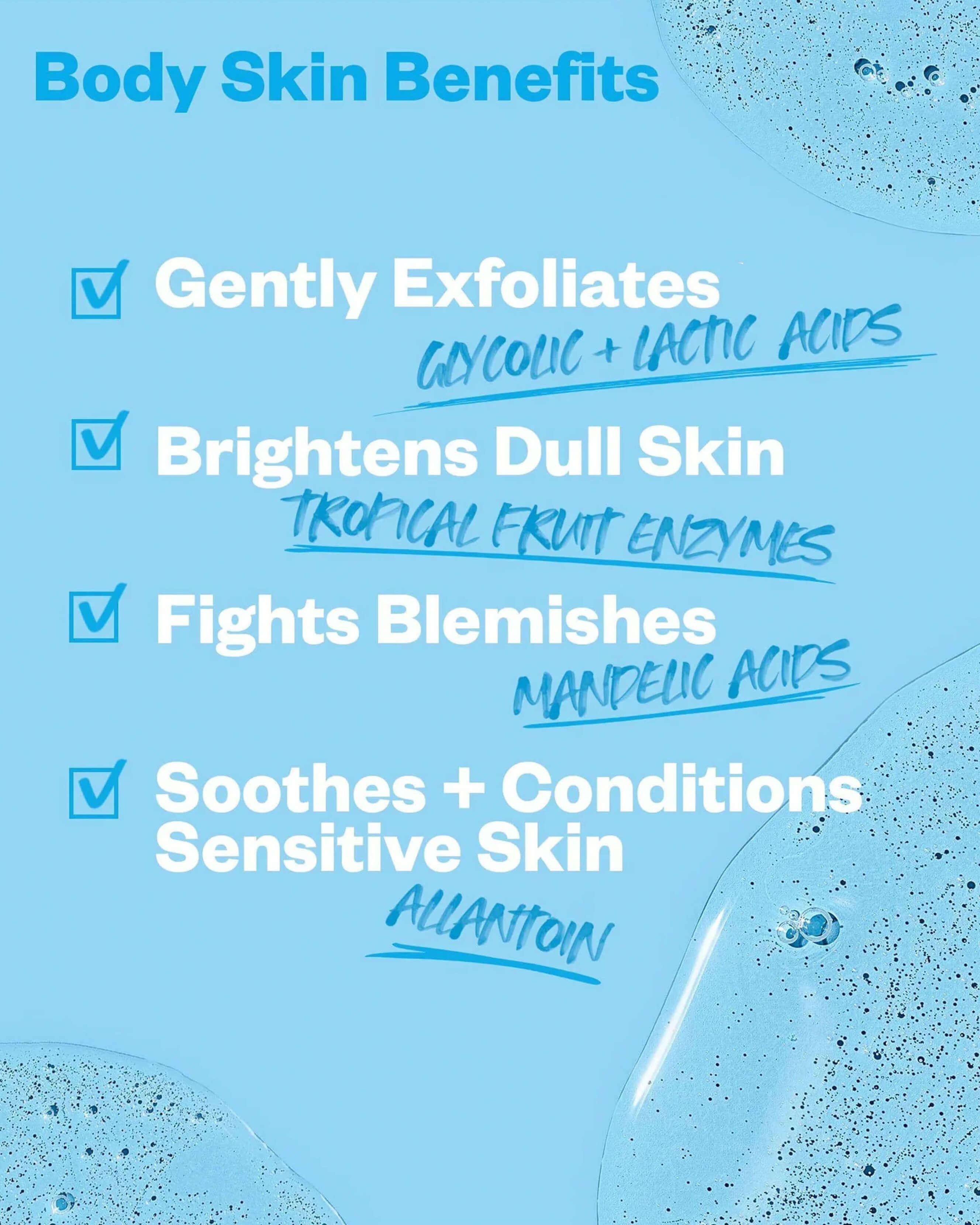 A daily-exfoliating body gel cleanser with AHAs and fruit enzymes that unclogs pores, visibly smooths texture, and fights blemishes.
