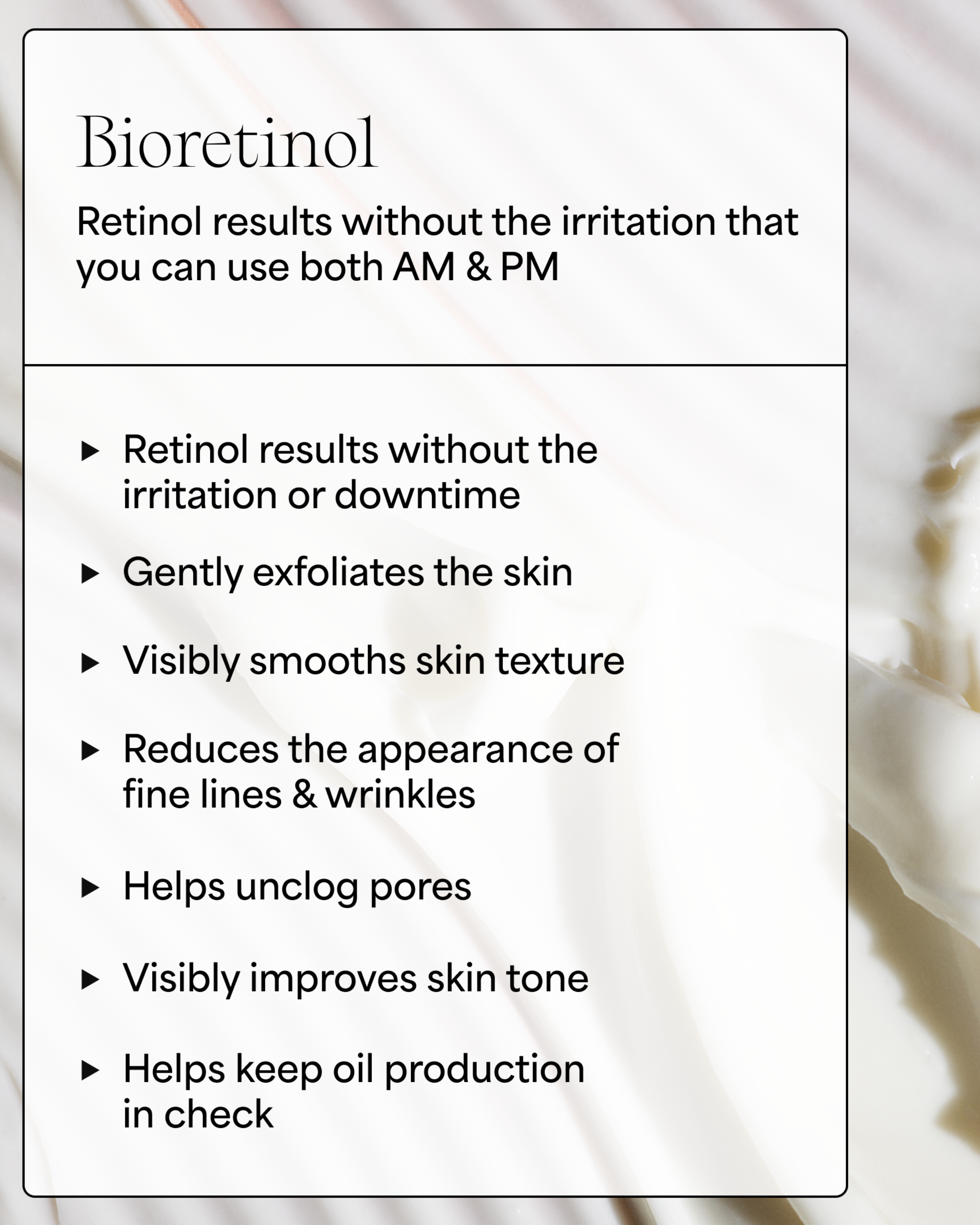 A proprietary complex of Bio Retinol (Rock Samphire) and Irish Sea Moss work to minimize wrinkles and firm skin–without irritation. Boosted with Marshmallow Root and Slippery Elm Bark delivering deep hydration to soothe and plump tired skin. Infused with the calming vibration of Moonstone.