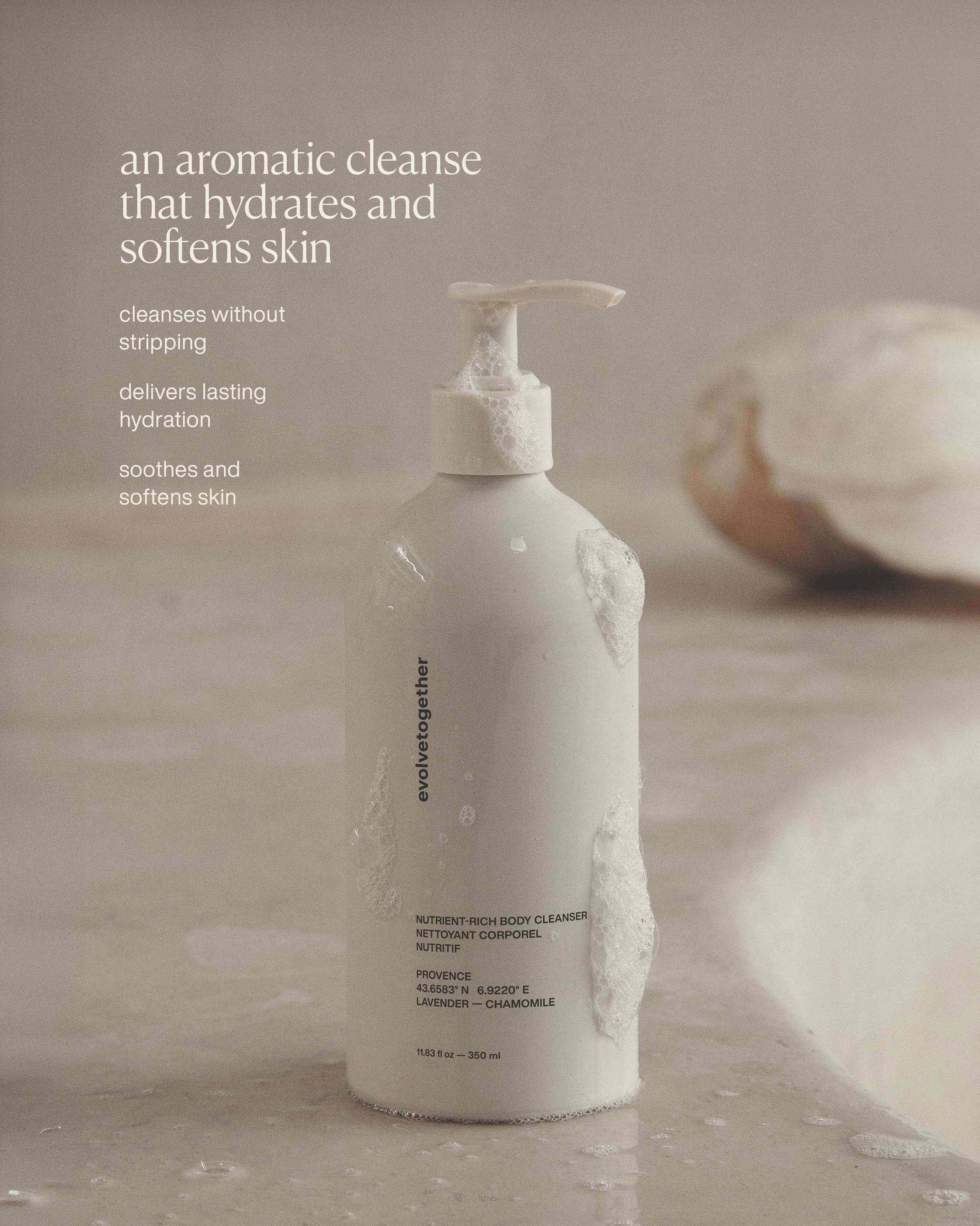 A cream body cleanser that gently cleanses, hydrates, and leaves skin soft, with a calming scent of chamomile, lavender, vanilla, and green wood.