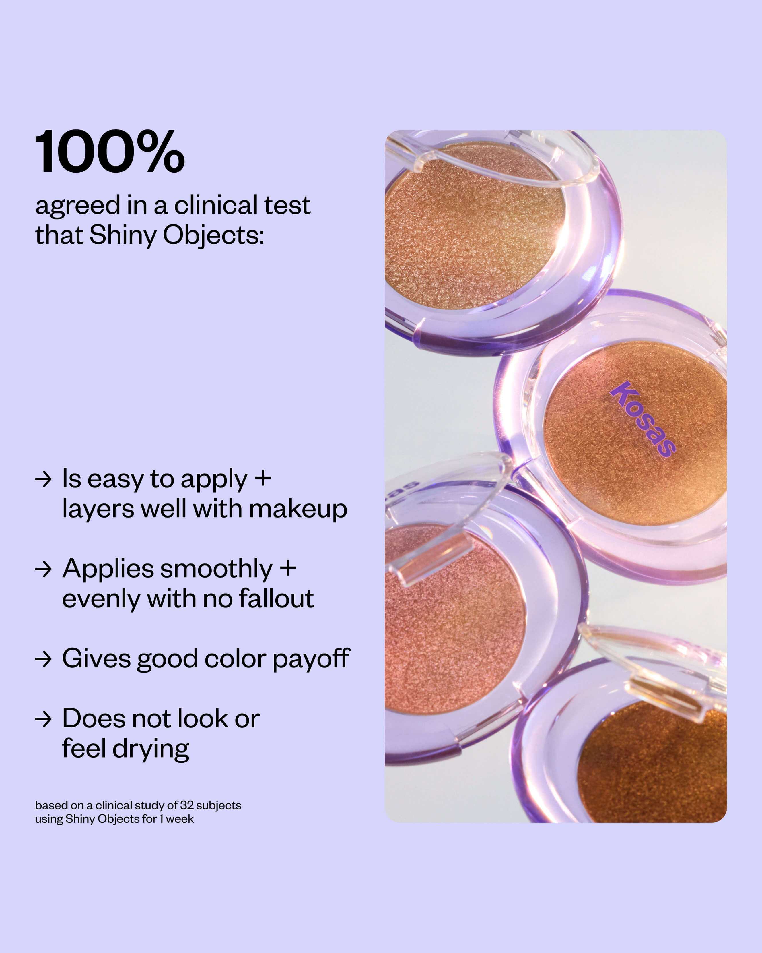 Use it at any step. Shiny Objects layers effortlessly and plays well with creams, liquids + powders.