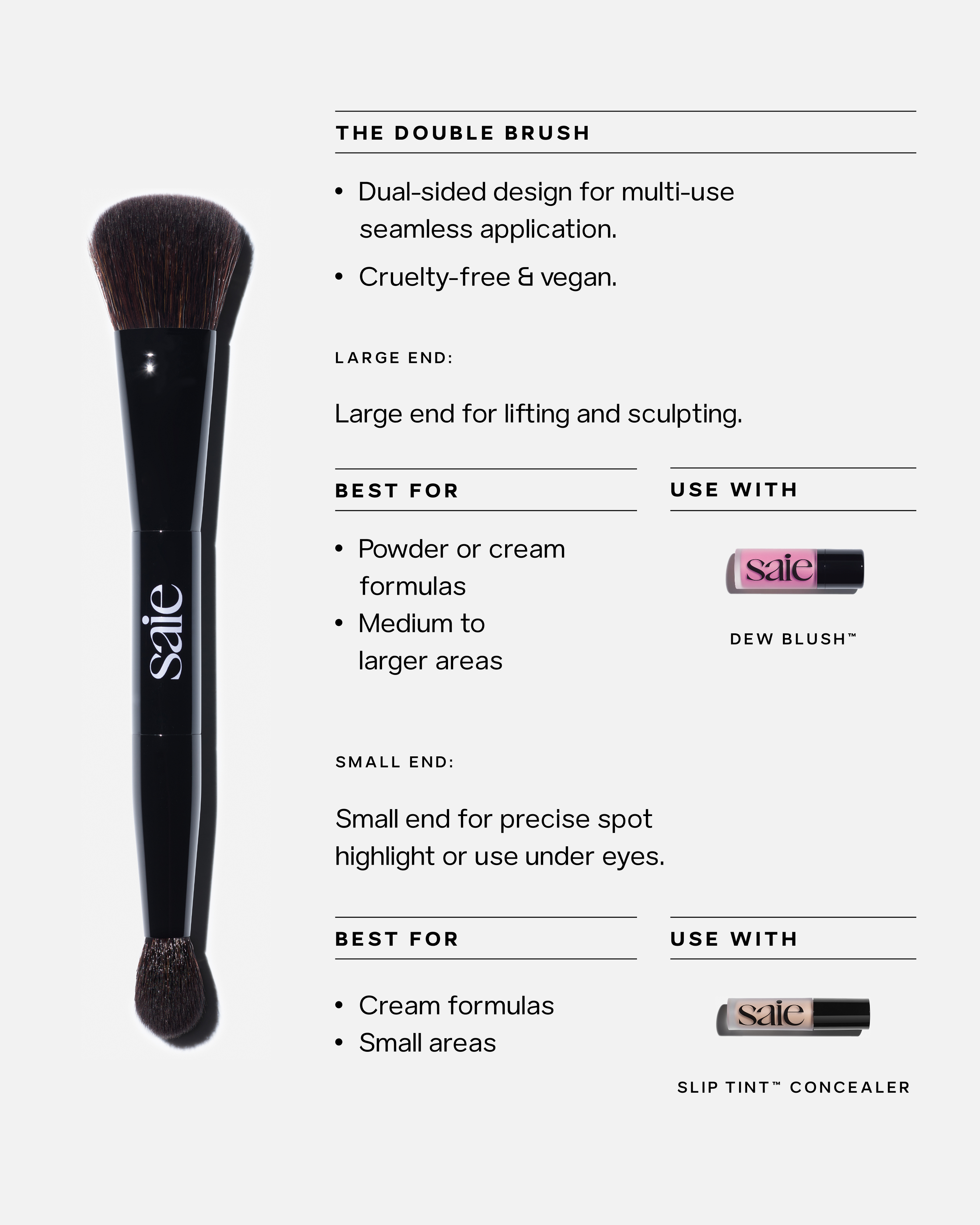 Pro Tips: Keep the small end of the brush clean and toggle between sides while blending to build coverage gradually without applying too much product at once.